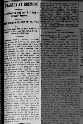 – January 20, 1900 – The murder took place in Bremond, Texas. Max Stellbauer (Justice of the Peace) was killed by MP Long, who was seriously wounded.