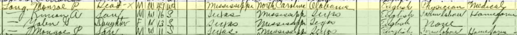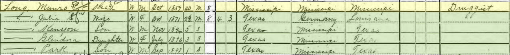 Eli solved the mystery when he found the Robertson County census, taken June 1, 1900. Bremond is in Robertson County, as were Munro Long, Julia Long, Mongo Park Long, Glendora Long, and Kenyon Long. (Note the different spellings/names used for the father and son Monroes.)