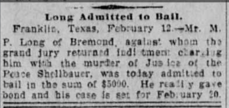 – February 12, 1900 – The Houston Post newspaper reports that Long gets out of jail on $5,000 bail. (Almost $154,000 in today’s money.)