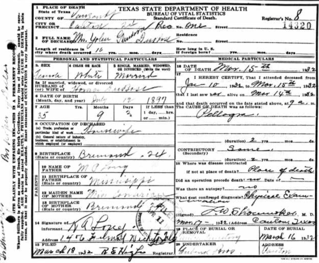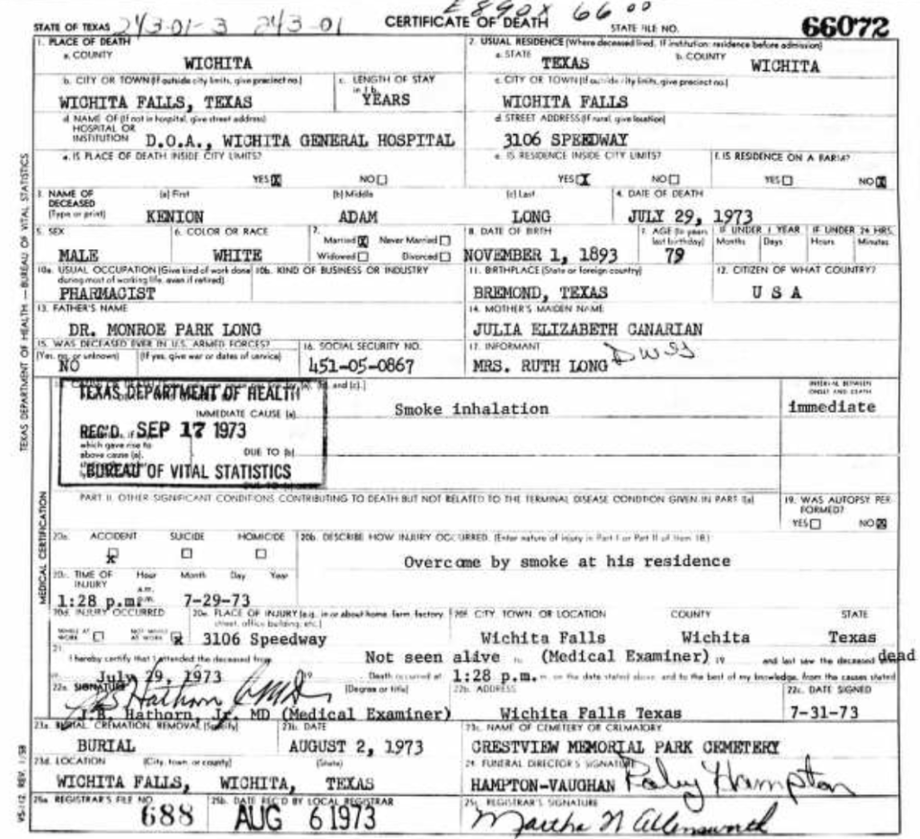 It seems that our ancestor was most likely the MP Long who killed the Bremond Justice of the Peace, Max Stellbauer – in self defense. According to newspaper articles, they had been at the pharmacy in Bremond. It was between 11pm and 12pm when they each fired five rounds at each other. Max died, but Long survived.